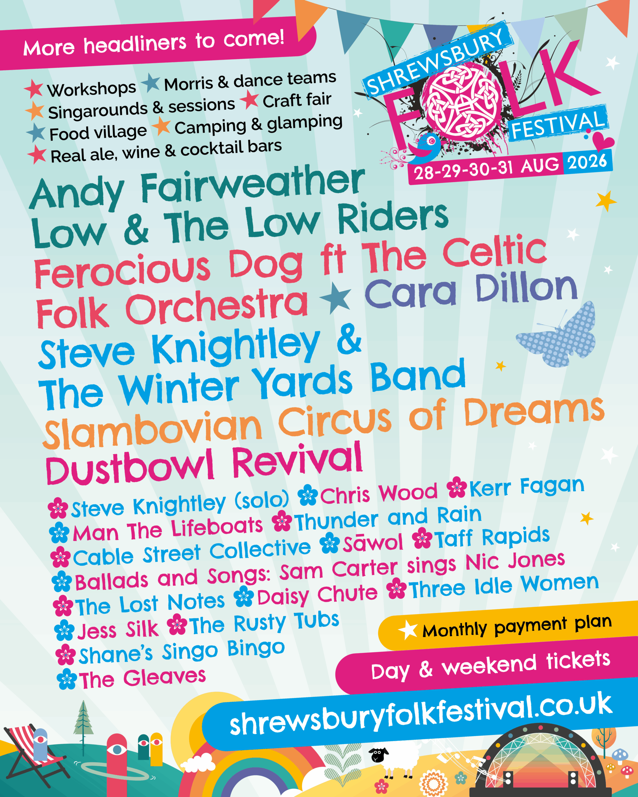 Leading the bill will be one of Britain’s most enduring songwriters and guitarists, Andy Fairweather Low with his band The Low Riders. We will also host the ONLY 2026 festival show for Ferocious Dog featuring The Celtic Folk Orchestra as the band prepares to bow out of performing. Also appearing will be acclaimed Irish singer Cara Dillon, whose pure voice and heartfelt songs have captivated audiences worldwide.