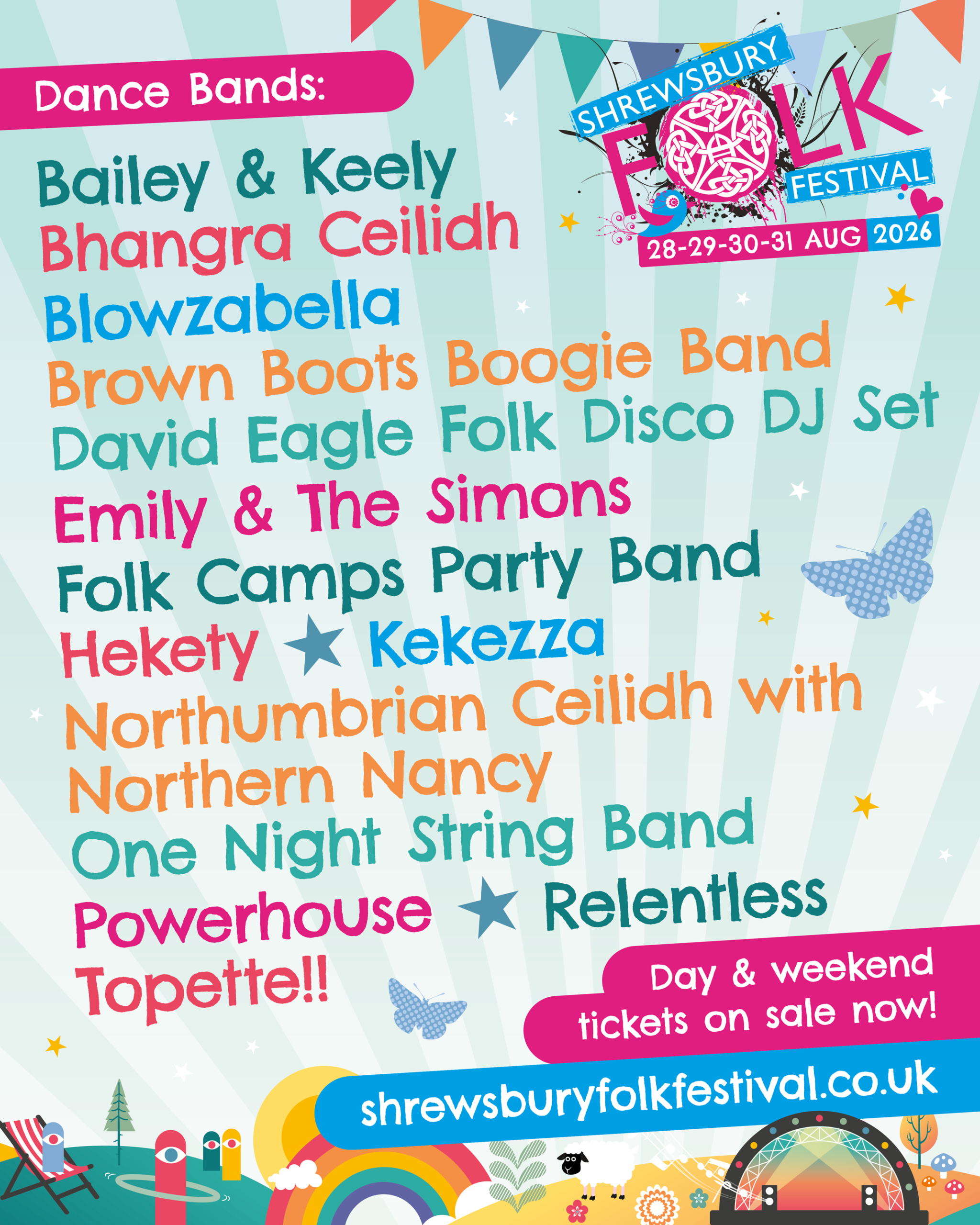 The festival’s 2026 dance band line-up has also been announced and includes Bailey & Keely, Bhangra Ceilidh, Blowzabella, Brown Boots Boogie Band, a David Eagle Folk Disco DJ Set, Emily & The Simons, Folk Camps Party Band, Hekety, a Northumbrian Ceilidh with Northern Nancy, One Night String Band, Powerhouse, Relentess Ceilidh Band and Topette!!. Cornish troupe Kekezza will perform the annual dance show and there will also be the dance party and displays from morris and dance teams throughout the weekend.